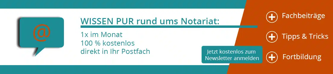 Bleiben Sie auf dem Laufenden mit dem kostenlosen Newsletter von NotarPraxis Wissen: Einmal im Monat kommt eine kurzweilige Mischung aus relevanten Fachbeiträgen, lesenswerten Editorials und aktuellen Meldungen in Ihr E-Mail-Postfach: Alles, was Sie wissen müssen für Ihre Notariatpraxis.